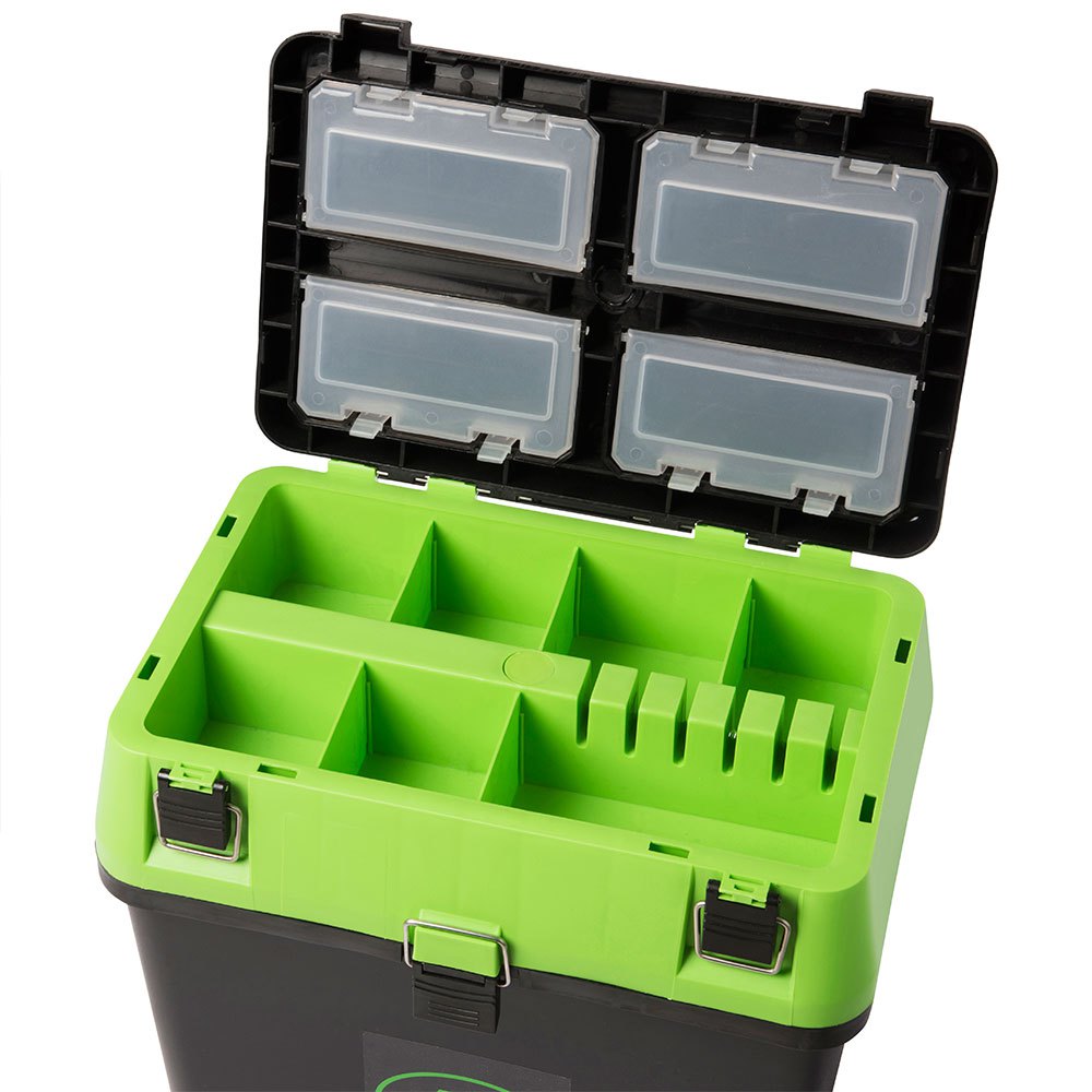 – Organización Superior: La parte superior del cajón cuenta con 4 cajas para accesorios, perfectas para clasificar señuelos, anzuelos y otros pequeños utensilios. Además, incluye apartados con separadores que permiten mantener todo en su lugar, evitando enredos y pérdidas.